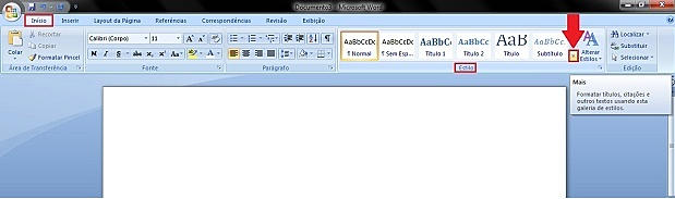 Passo 1. Antes de criar o índice, precisamos definir as opções de formatação dos títulos. Para isso, clique na guia “Início” e, dentro do grupo “Estilo”, clique na seta correspondente à opção “Mais”, como mostra a imagem abaixo;